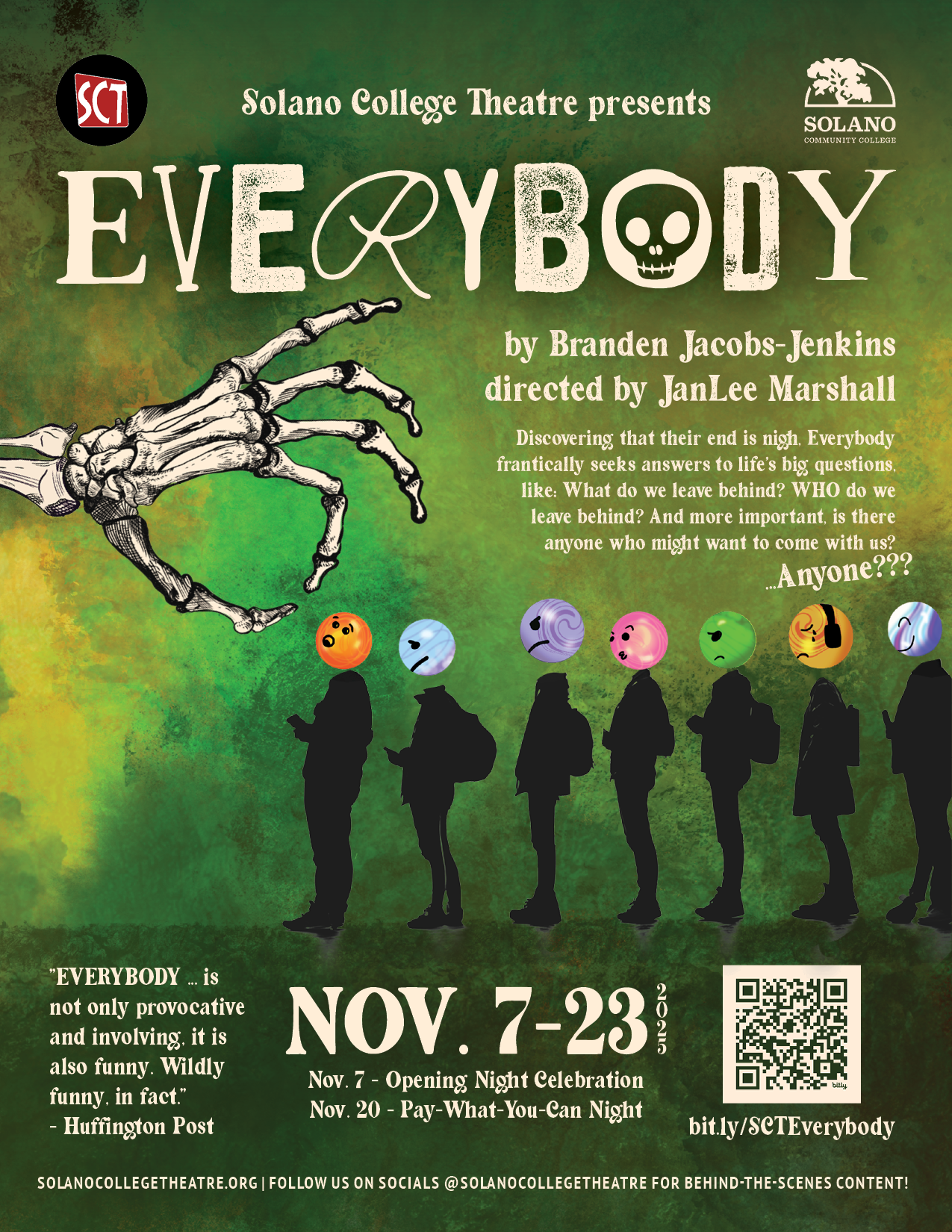 Discovering that their end is nigh, the character Everybody frantically seeks answers to questions like: What do we leave behind? WHO do we leave behind? And most important, isnβt there anyone who might want to come with? ...Anyone? ANYONE?!!?!